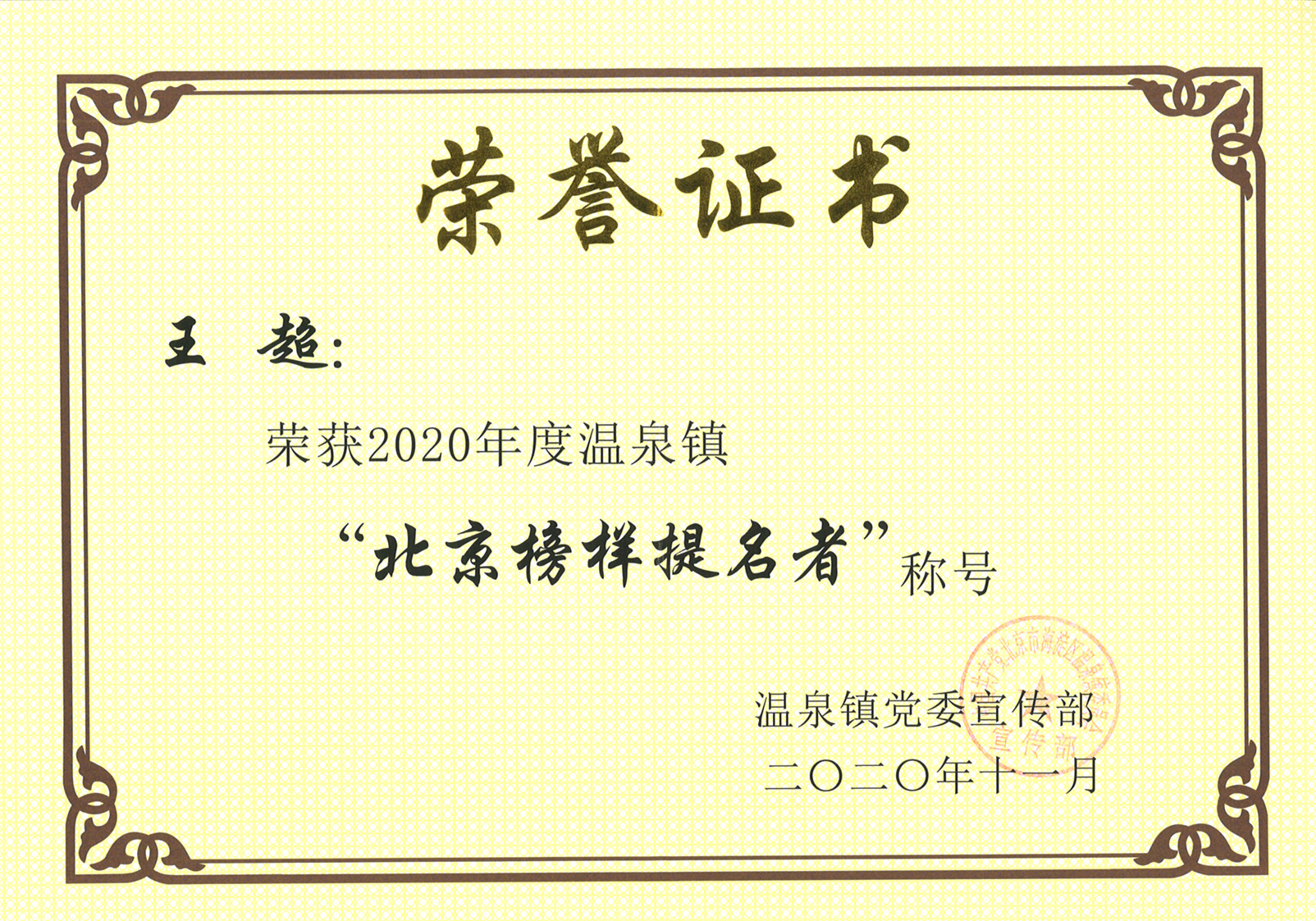 2020年11月,麥斯達(dá)夫“標(biāo)兵共產(chǎn)黨員服務(wù)隊(duì)”王超、謝小東被海淀區(qū)溫泉鎮(zhèn)黨委宣傳部評(píng)為“北京榜樣提名者”。“2020北京榜樣”活動(dòng)由中共北京市委宣傳部、首都精神文明建設(shè)委員會(huì)辦公室主辦,北京廣播電視臺(tái)、北京人民廣播電臺(tái)承辦,旨在全市選樹(shù)一批“崇德向善 奮發(fā)向上”的榜樣人物,充分發(fā)揮榜樣的引領(lǐng)和示范效應(yīng),持續(xù)打造培育和踐行社會(huì)主義核心價(jià)值觀的品牌活動(dòng),匯聚強(qiáng)大正能量,著力在全市推動(dòng)形成良好的輿論氛圍、文化氛圍、社會(huì)氛圍,為建設(shè)國(guó)際一流的和諧宜居之都提供強(qiáng)大的精神動(dòng)力和道德支撐。