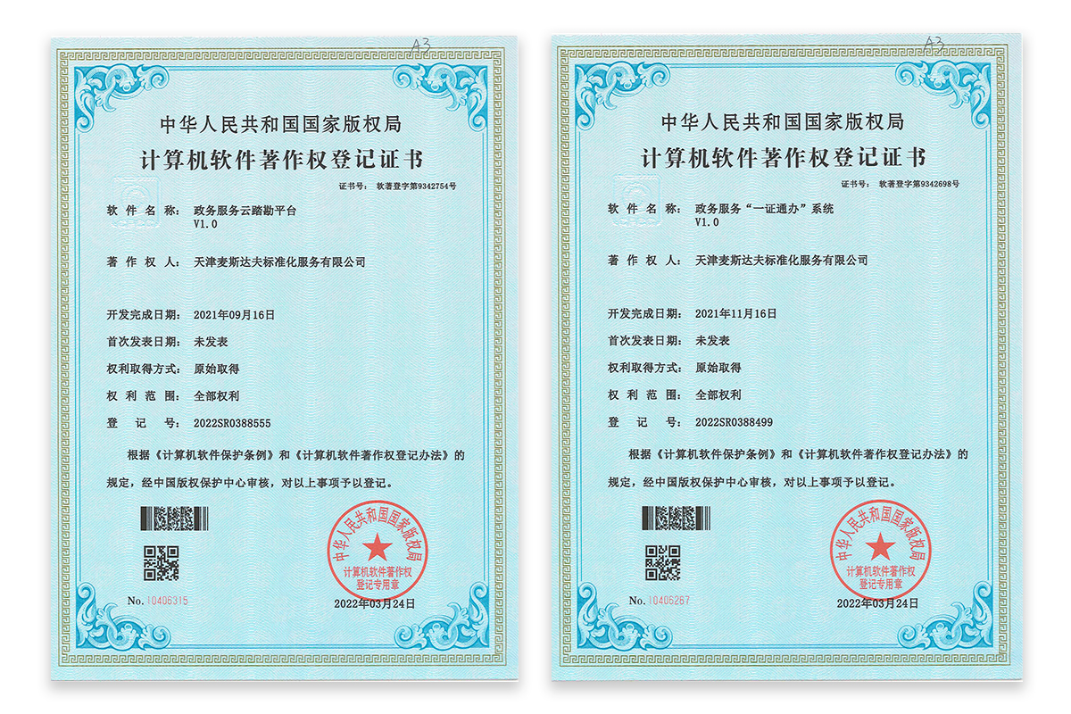 2022年5月16日,天津麥斯達夫標準化服務有限公司獲得兩項軟件著作權證書,“政務服務云踏勘平臺V1.0”“政務服務‘一證通辦’系統(tǒng)V1.0”。