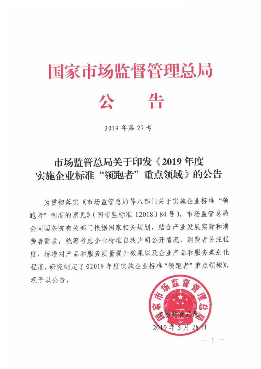 市場(chǎng)監(jiān)管總局關(guān)于印發(fā)《2019年度實(shí)施企業(yè)標(biāo)準(zhǔn)“領(lǐng)跑者”重點(diǎn)領(lǐng)域》的公告