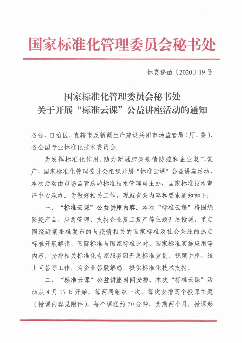 國家標(biāo)準(zhǔn)化管理委員會秘書處關(guān)于開展“標(biāo)準(zhǔn)云課”公益講座活動的通知