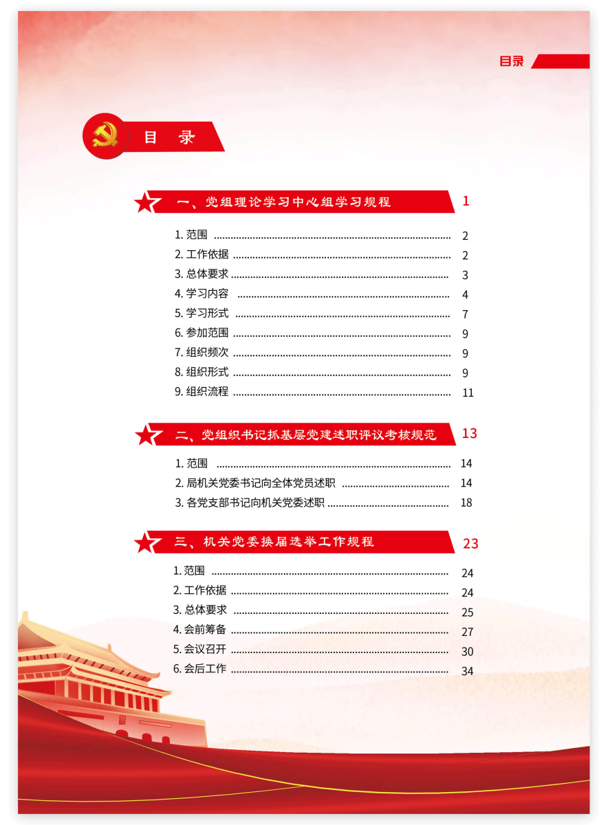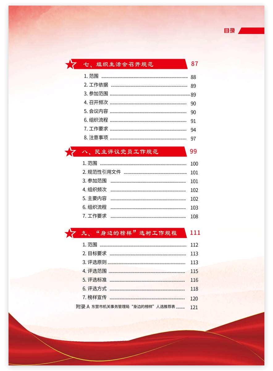 《東營市機關事務管理局機關黨建工作標準》(圖解版)系統(tǒng)梳理了機關黨建工作的規(guī)章制度,把機關黨建工作的內容、要求、流程都以標準的形式固定下來。全書涵蓋了黨組理論學習中心組學習、黨組織書記抓基層黨建述職評議考核、機關黨建換屆選舉、黨員發(fā)展、“三會一課”、主題黨日活動、組織生活會、民主評議黨員、“身邊的榜樣”選樹等九個方面的工作,既包含了機關黨建的規(guī)定動作,也在黨建工作與業(yè)務工作融合上進行了初步探索,供黨建工作者學習參考。全書以“標準圖解版”的形式呈現(xiàn),一共繪制了242張圖片,每一個場景、每一個細小元素均經過精心設計。