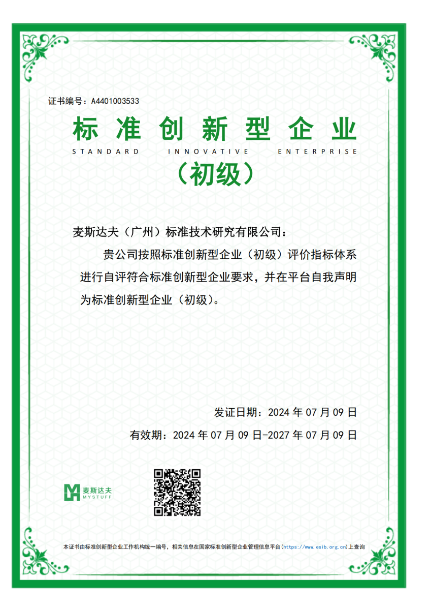 麥斯達夫(廣州)標準技術(shù)研究有限公司夫獲評標準創(chuàng)新型企業(yè)