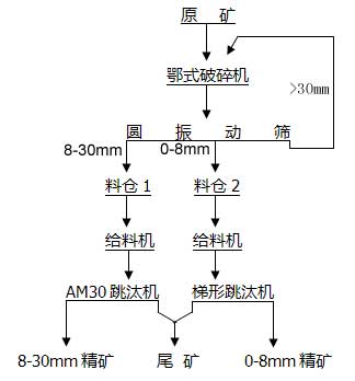 首先,大塊重晶石礦需經(jīng)過破碎,將大塊礦破碎至小塊,使重晶石與廢石單體解離,由于重晶石性脆易碎,因此該破碎過程一般選用鄂式破碎機。其次破碎后的重晶石礦中粗細(xì)不均勻,為了使破碎產(chǎn)品粒度達(dá)到重選最佳入選粒度,常常需要經(jīng)過篩分,將礦石篩分為0-8mm和8-30mm兩種粒級,并別進(jìn)入料倉和給料系統(tǒng)。電磁振動給料機保證了物料給入的均勻有序,使跳汰機選礦效果達(dá)到最佳,兩種粒級物料分別給入梯形跳汰機和AM30跳汰機,最終獲得粗粒精礦,細(xì)粒精礦和尾礦,經(jīng)過脫水分別輸送至各自物料場地。