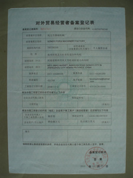 對(duì)外貿(mào)易登記表